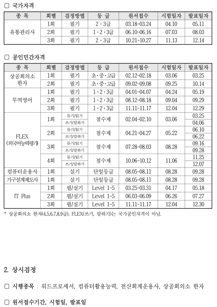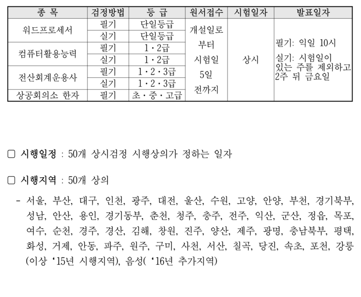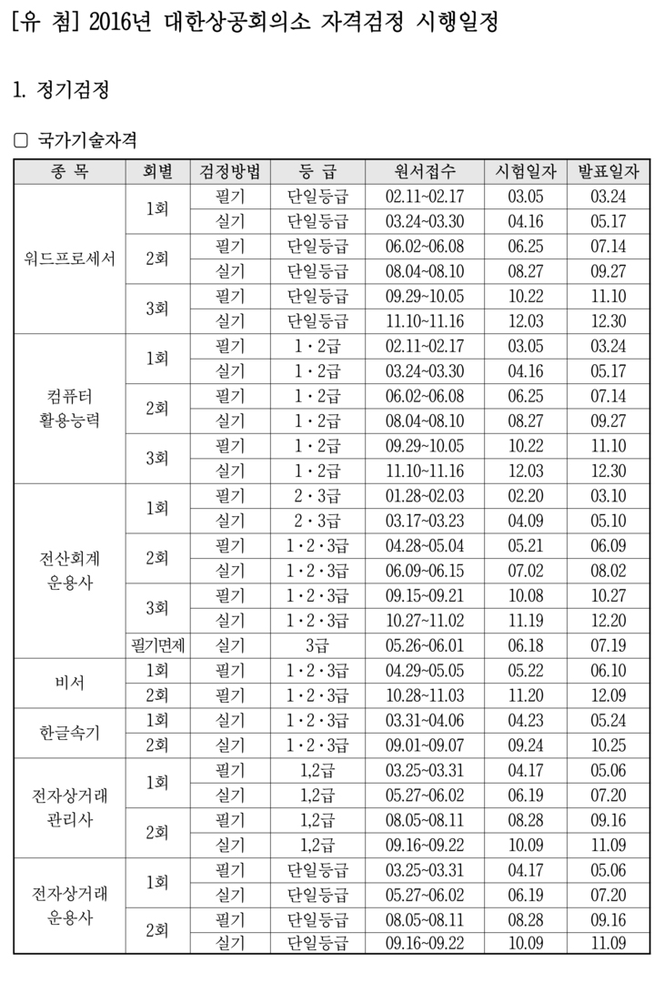 2016 대한상공회의소 자격검정(컴퓨터활용능력/워드프로세서) 시행일정