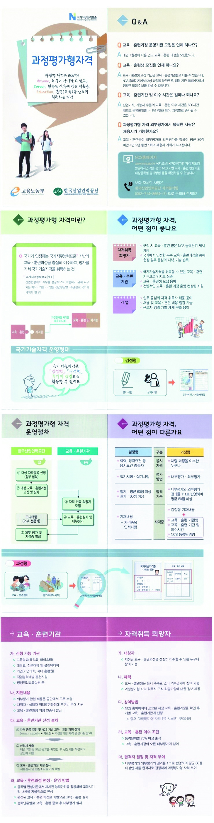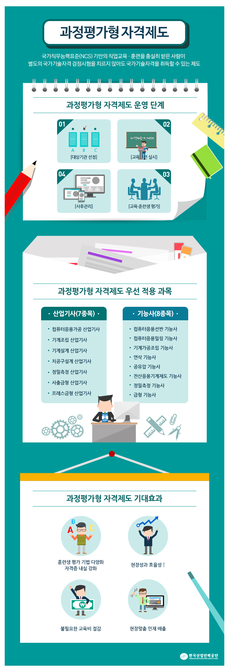 ➮ 국가직무능력표준(NCS)에 기반한 교육 훈련과정을 이수하고 내부 외부 평가를 거쳐 합격기준을 충족하는 교육훈련생에게 국가기술자격증을 부여하는 제도입니다.